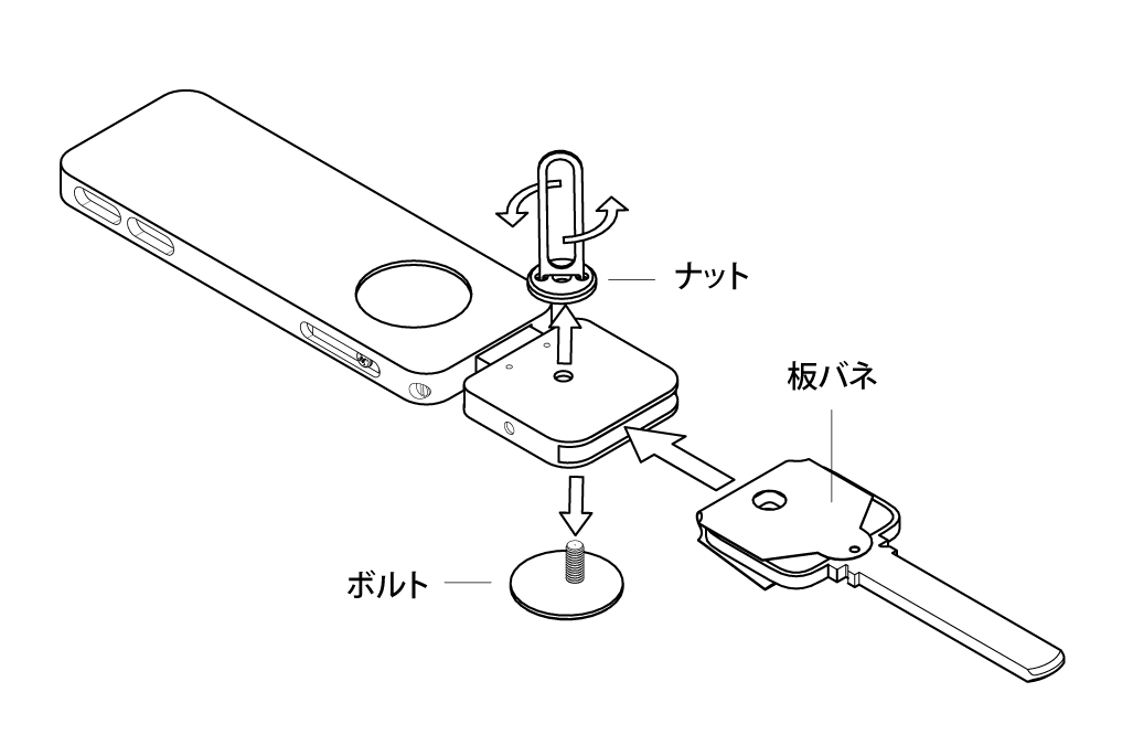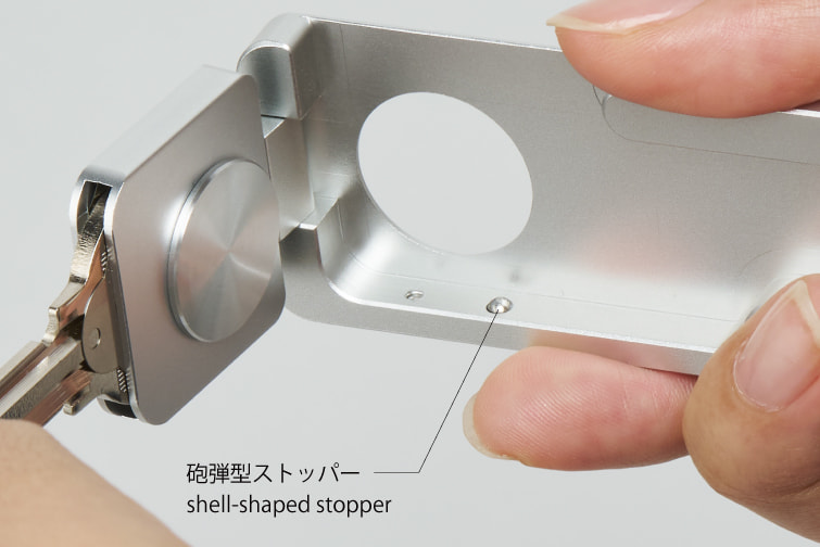 キーカバーの本体フレームへの脱着は「砲弾型ストッパー」によって行われる構造です。鍵を取出したり戻したりする際の「カチッ」とロックされる感触も、精密な金属加工ならではの心地よさです。※ 特許(第6797446号)
