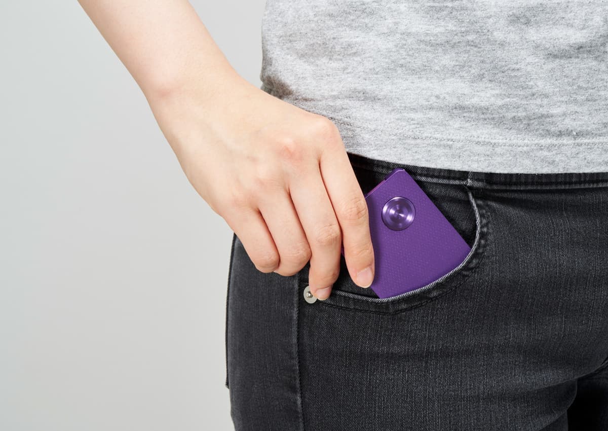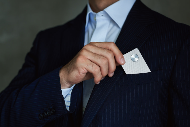 スーツやパンツのポケットにもスッキリ納まるサイズです。とても軽いので、身に付けても、鞄などに入れて持ち歩いても気になりません。