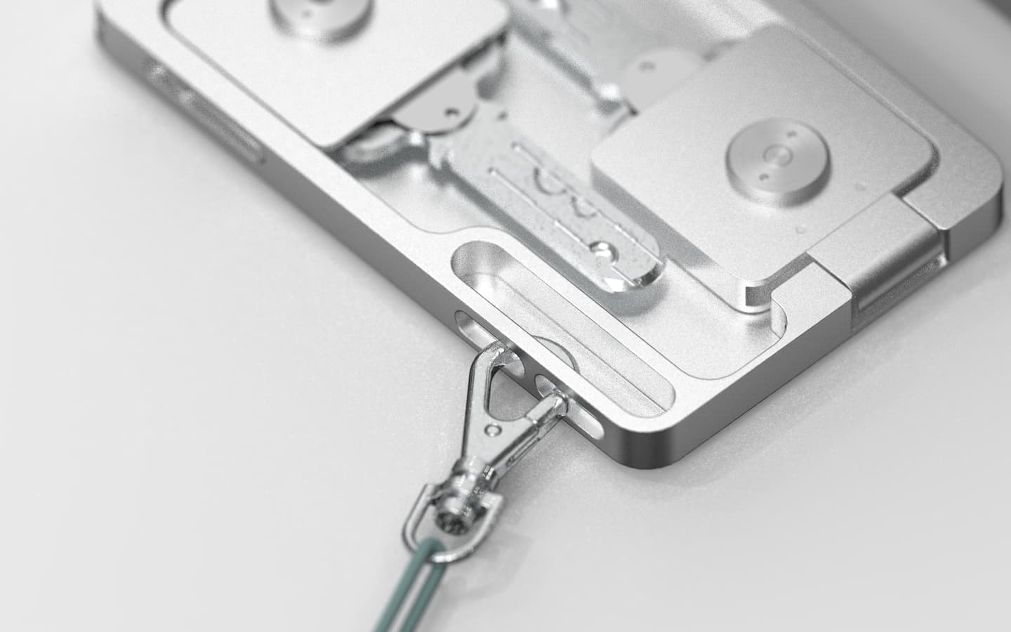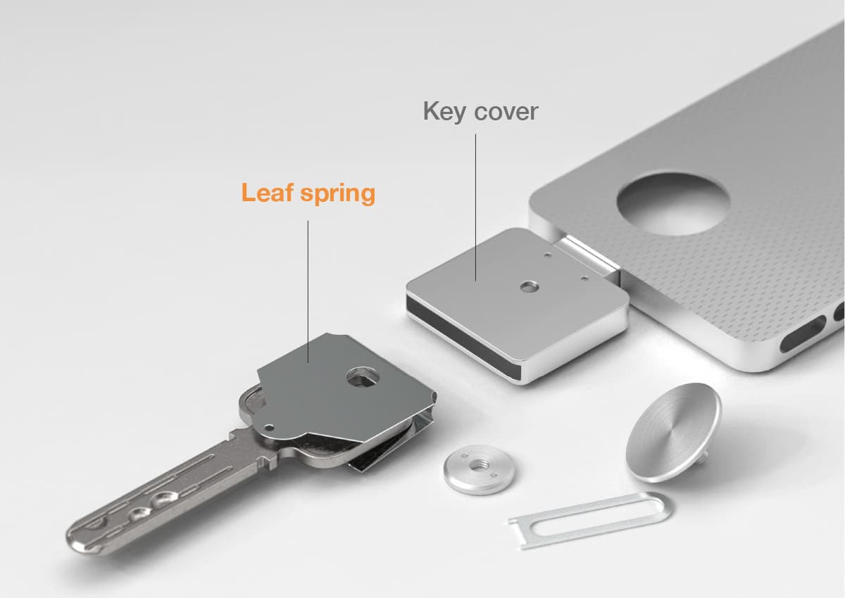 To secure a key in place, we designed a structure in which the key is held in place by a bolt and a nut, with a uniquely designed leaf spring encasing the head of the key. Since the spring directly holds the key with tensioning, no uncomfortable noise is generated when a user carries the case. (Japanese Patent No. 6797446)