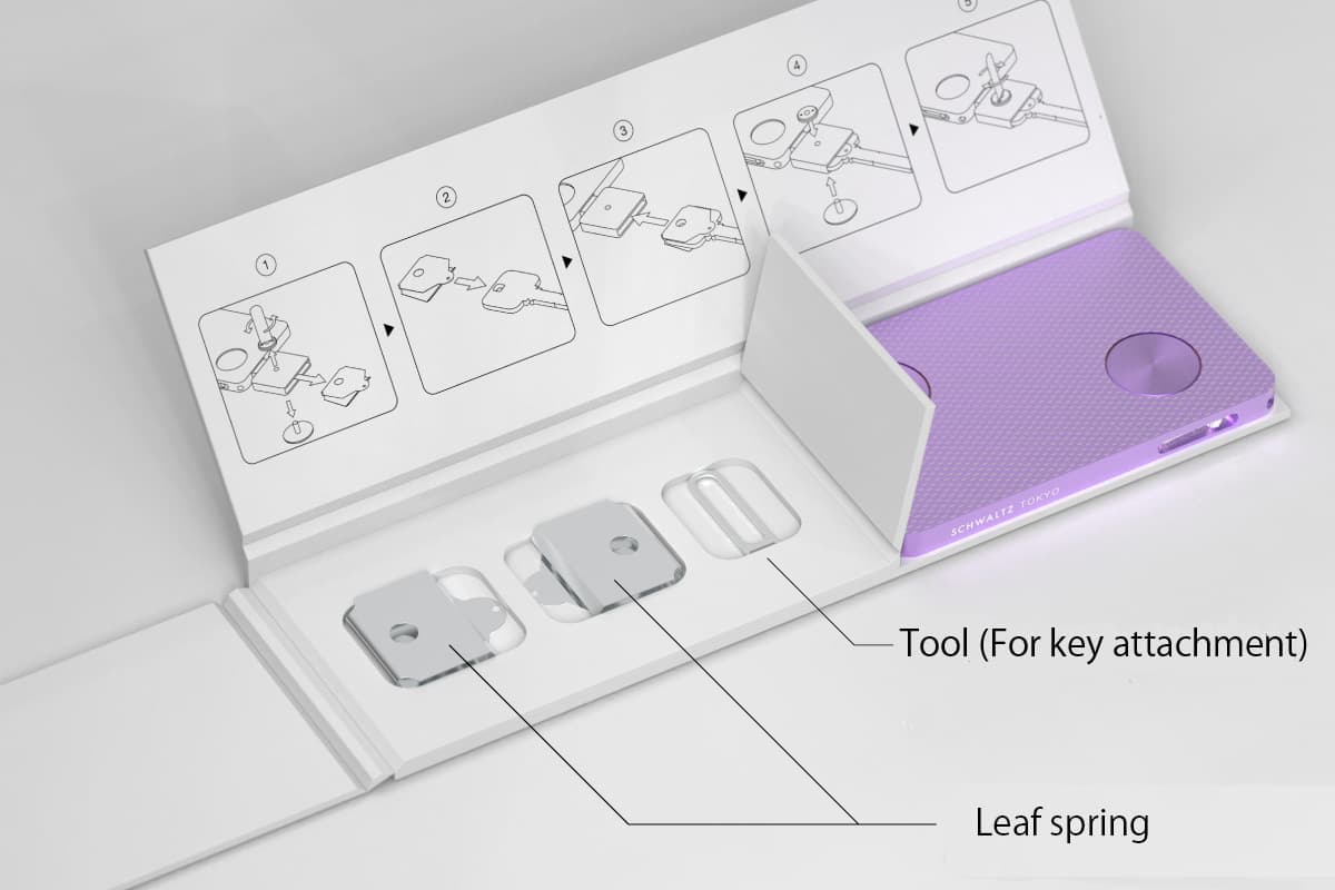 The uniquely designed leaf spring wraps around the head of the key and it suppresses the uncomfortable noise of metal against metal, which has been a drawback of conventional metal key cases. (Japanese Patent No. 6797446)